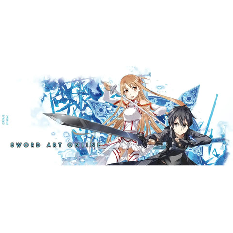 The design showcases Sword Art Online’s beloved duo, Asuna and Kirito, wielding their iconic swords in a dynamic pose that embodies their fighting spirit. The matte finish enhances the vivid artwork, making every sip a reminder of their epic digital battles. It's a perfect way for fans to celebrate the series while enjoying their favorite beverage, whether it’s coffee, tea, or a potion to replenish stamina.