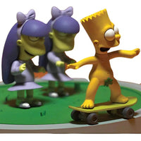Introducing The Simpsons - Bart, Sherri, and Terri: "Doodle Double Dare" Action Figure by McFarlane from The Simpsons Movie series. This action figure brings to life the memorable "Doodle Double Dare" scene with motorized play action, featuring a nearly au naturel Bart! With the push of a button, Bart circles Sherri and Terri on his skateboard. This collectible is available exclusively in specialty stores and is a unique addition to your collection.