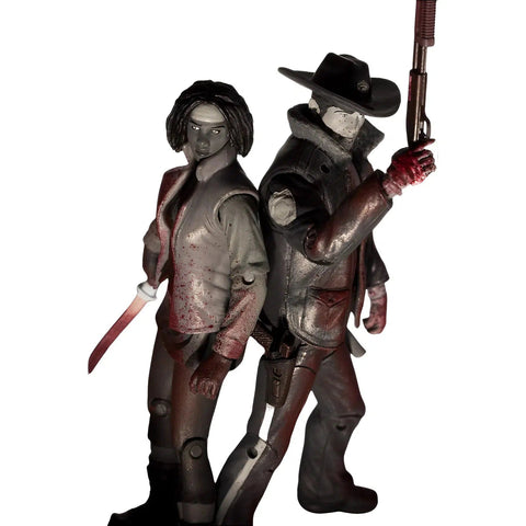 Introducing the Black & White Rick Grimes and Michonne 2-Pack Action Figures from "The Walking Dead (Comic)" by McFarlane. These exclusive, blood-spattered collectibles bring back the iconic duo from the series, packed with detail and authenticity.