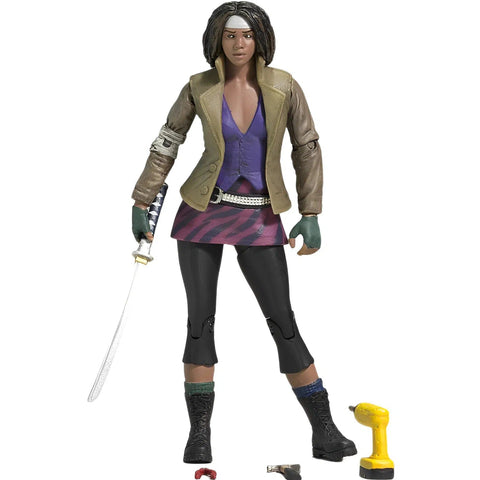 Deadly Arsenal: Michonne is armed with her signature katana sword, ready to take on the undead. Additionally, the figure includes various implements of revenge, including a power drill, hammer, pliers, and a spoon, adding to the authenticity of the character.