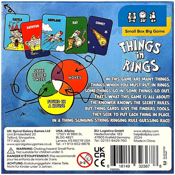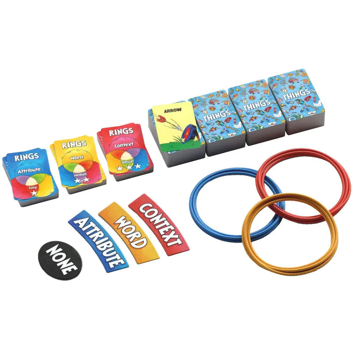 Get ready for an engaging and brain-teasing party experience with Things In Rings, a puzzle game where logic, creativity, and deduction collide. Set up the Rings in the center of the table to form a triple Venn diagram, and prepare for a fun-filled challenge that tests your understanding of various logic rules. One player takes on the role of "The Knower," who knows the rules for each Ring and guides the game, while everyone else starts with a hand of five object cards.