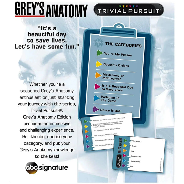 Step into the world of Seattle Grace Mercy West Hospital with Trivial Pursuit: Grey’s Anatomy Edition! This thrilling trivia game lets fans of the hit TV series test their knowledge with 600 questions spanning the show's unforgettable moments, beloved characters, and dramatic storylines.