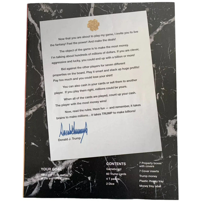 Unleash your inner tycoon with Trump: The Game, the high-stakes board game from Parker Brothers that challenges players to become the next big business mogul. In this strategic game, you aim to amass the most cash by turning $500 million seed money into billions through shrewd deals and savvy investments.