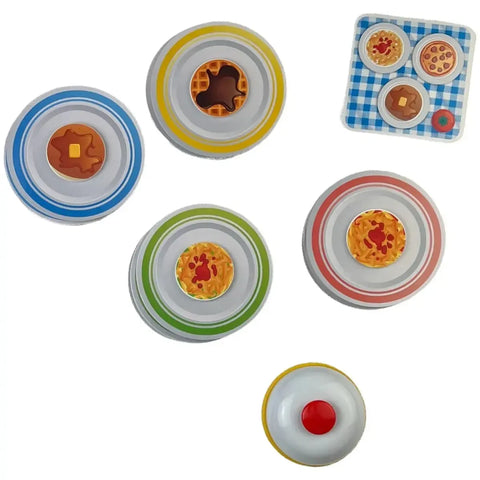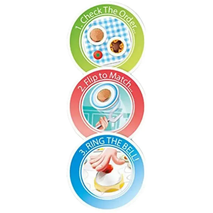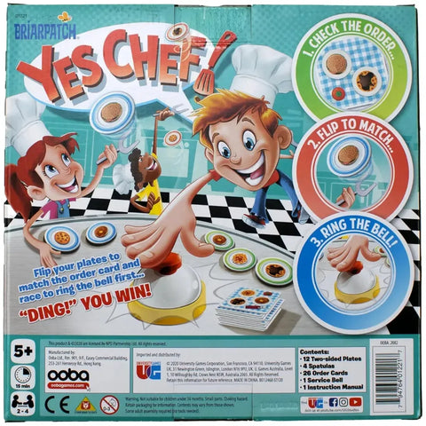 Yes, Chef! is a unique skill and action game where kids check the order card, use their spatulas to flip their plates to match the dishes shown, then race to be the first to ring the bell and fill the order. But if you see a cockroach, you must slap that order card instead to squash the bug. The chef who collects the most order cards wins in this fast-paced matching game!