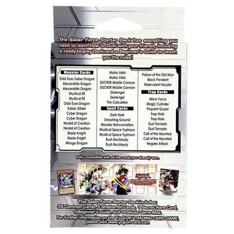 Dive into the contents of the Saber Force Starter Deck, featuring 35 common cards, 5 shatter-foil cards, and 1 secret rare card. The back of the package details the list of all cards, categorized by type, such as Monsters, Spells, and Traps. While the types are outlined, the rarity of each card adds an exciting element of surprise to this dynamic deck.