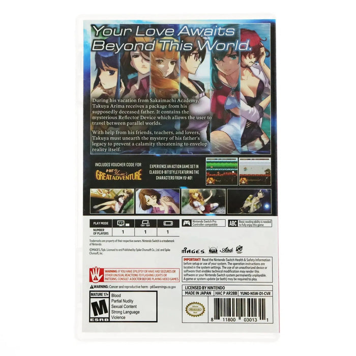 Unravel the enigmatic secrets of Sword Cape in "Yu-No: A Girl Who Chants Love at the Bound of this World (Day One Edition)" for Nintendo Switch. As Takuya, a student of the academy, delve into a captivating tale where time travel reveals hidden truths. Armed with the Reflector Device bestowed by his late father, journey across timelines to uncover the mysteries lurking beneath the surface.